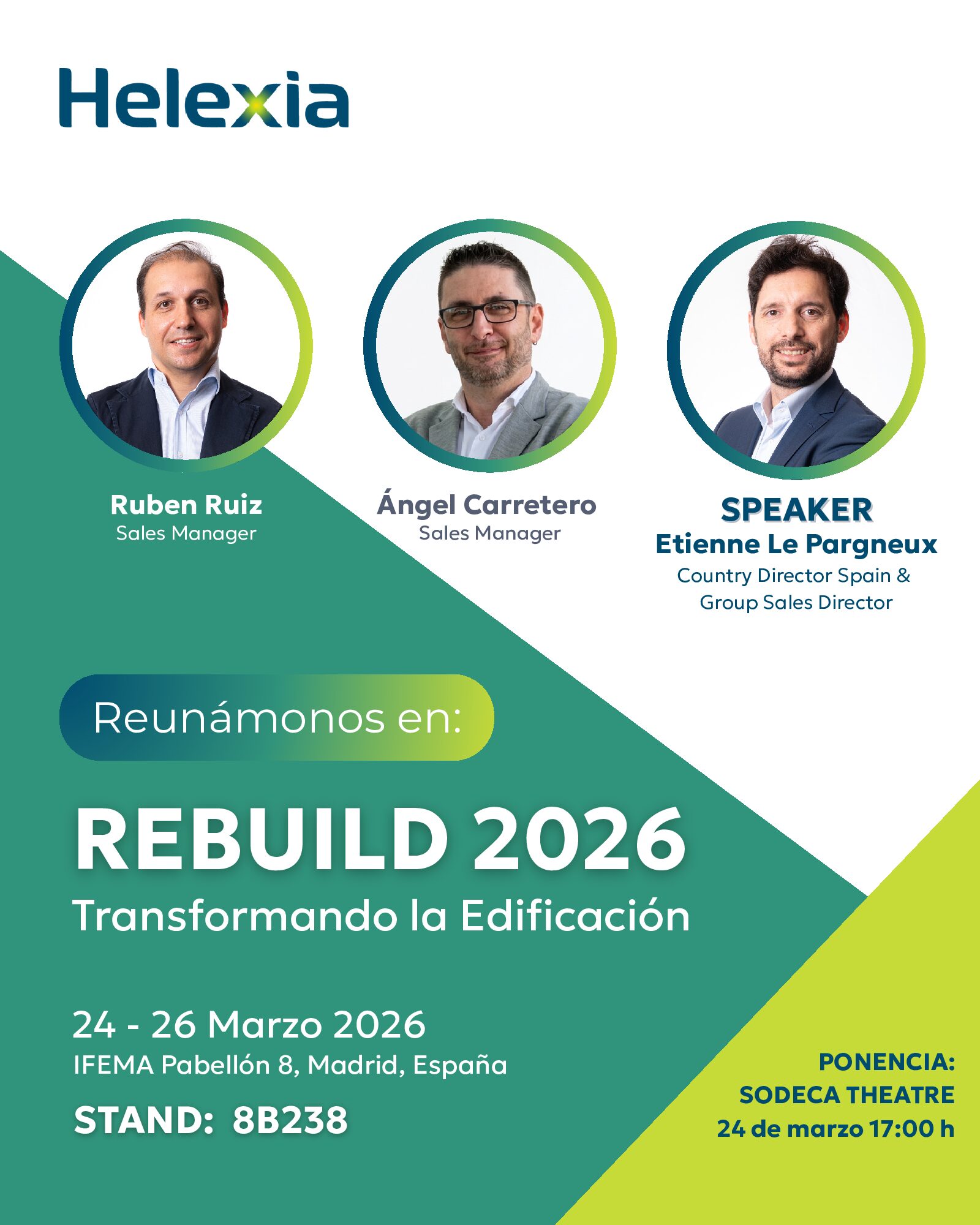 En Helexia España, damos un paso al frente en REBUILD 2026, el evento de referencia para la edificación y la rehabilitación, que tendrá lugar en IFEMA (Madrid) del 24 al 26 de marzo.